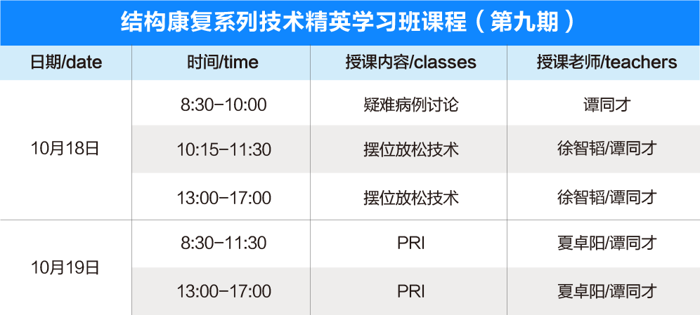 由杭州东方华康康复医院主办的结构康复系列技术精英学习班第九期延期至10月18−19日开课,学习班报名截止10月11日。本期课程聚焦“摆位放松技术”、“PRI”,并新增疑难病例讨论环节,通过理论与实践相结合的创新模式,为全国康复从业者打造前沿技术交流平台。